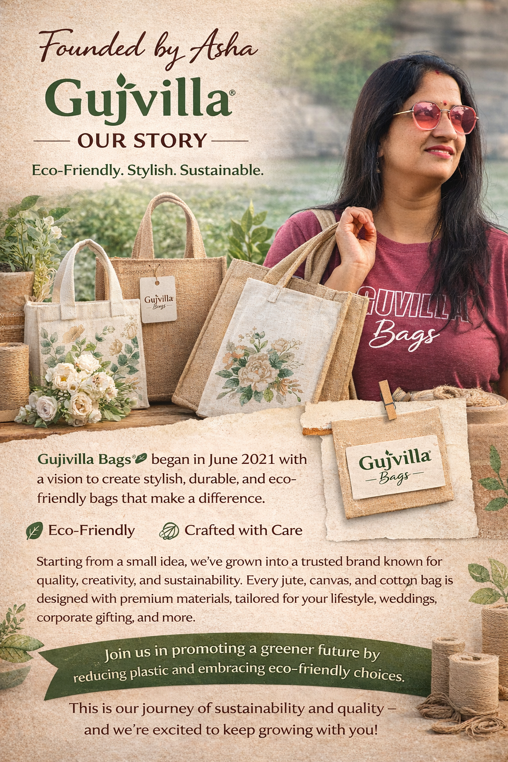 Gujvilla Bags® began its journey in June 2021 with a simple yet powerful vision — to create stylish, durable, and eco-friendly bags that truly make a difference. What started as a small idea