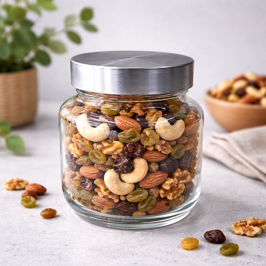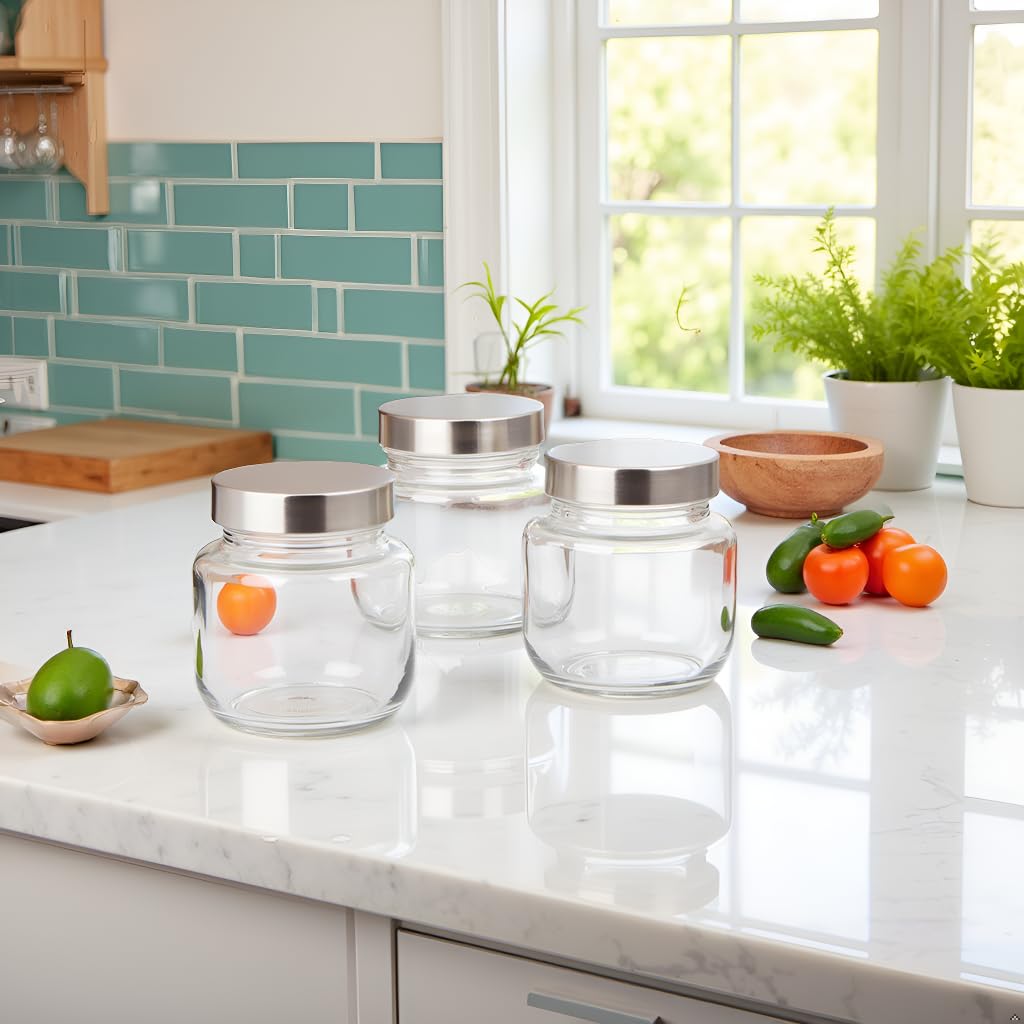 • Transform your kitchen organisation with these versatile YERA Aahar glass storage jars. Each 300ml jar in this set of 3 ( price given only 1 pcs ) features a distinctive red screw-top lid that provides a secure seal for your dry ingredients, spices, or small kitchen essentials. The clear glass construction allows you to easily identify contents at a glance, while the wide mouth design facilitates convenient filling and scooping. These sturdy jars are ideal for storing a variety of items from pulses and spices to nuts and dried herbs. The food-grade quality ensures safe storage of your edibles, while the compact size makes them perfect for modern kitchen shelves and countertops. The transparent design not only helps in quick identification but also adds a clean, organised look to your kitchen space. These practical storage solutions are easy to clean and maintain, making them an essential addition to any organised kitchen.